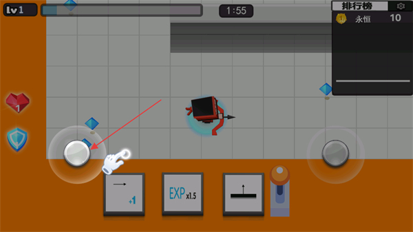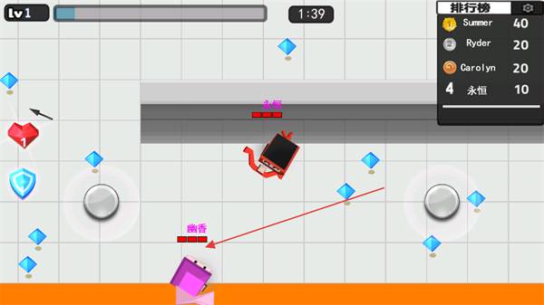 3、點擊右側(cè)按鈕控制角色移動,收集紅色愛心道具,恢復(fù)生命值,繼續(xù)參與對戰(zhàn)。