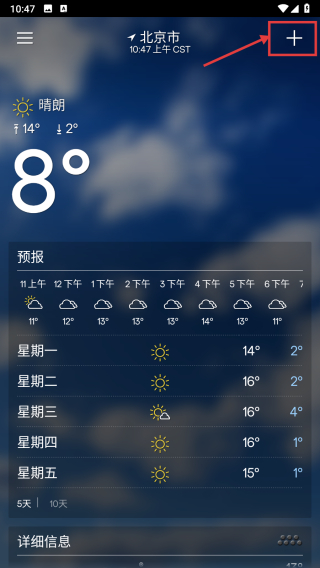 1、打開天氣類APP,點擊右上角+號按鈕,進入城市添加頁面。
