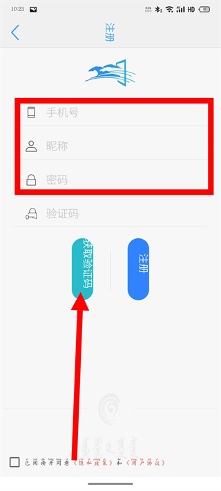 3、在注冊頁面,填寫手機(jī)號、昵稱、密碼,點(diǎn)擊獲取驗(yàn)證碼。