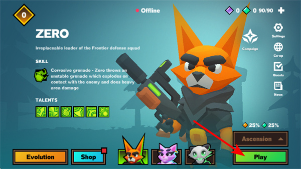 1、選擇角色投身戰(zhàn)斗,角色選擇是開啟冒險(xiǎn)的關(guān)鍵操作,點(diǎn)擊play開啟探險(xiǎn),開啟敵人消滅資源收集之旅。