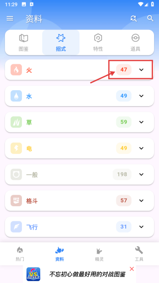 3、在招式分類頁(yè)面,選擇火屬性的47個(gè)招式,展開(kāi)火屬性招式列表。