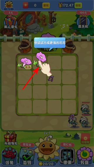 2、合成強(qiáng)力花朵,花朵合成是增強(qiáng)戰(zhàn)力的核心步驟,合成后可提升花朵的防御和攻擊能力,抵御僵尸進(jìn)攻。