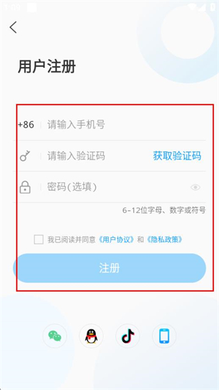 4、在用戶注冊頁面,輸入信息,勾選協(xié)議后點(diǎn)擊注冊按鈕,完成注冊操作。