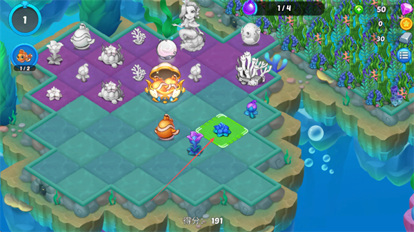 3、將相同的紫色植物移動到綠色區(qū)域進行合并,生成更高等級的植物。