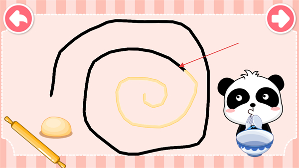 4、在下面的畫面中可以點擊面團拉出一條拉面放入熊貓寶寶的碗里,喂飽熊貓寶寶。