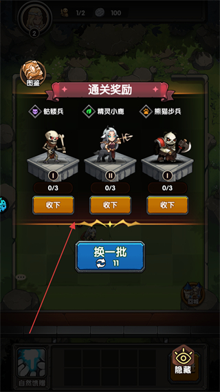 4、通關(guān)后,可選擇收下骷髏兵、精靈小娜、熊貓步兵等獎(jiǎng)勵(lì),增強(qiáng)己方戰(zhàn)力。