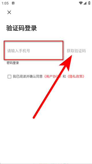 3、在登錄頁(yè)面,輸入手機(jī)號(hào)后,點(diǎn)擊獲取驗(yàn)證碼。