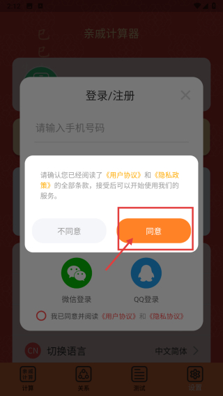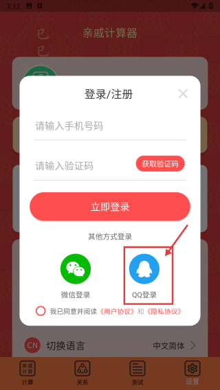 3、在登錄/注冊界面,點擊QQ登錄選項,彈出用戶協(xié)議確認框。