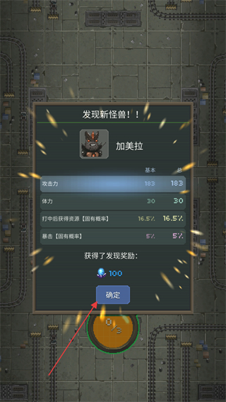 1、發(fā)現(xiàn)新怪獸加美拉后,點(diǎn)擊確定領(lǐng)取發(fā)現(xiàn)獎(jiǎng)勵(lì),獲得資源。