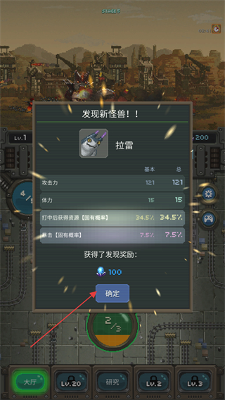 3、發(fā)現(xiàn)新怪獸拉雷后,點擊確定領取發(fā)現(xiàn)獎勵,獲得資源。