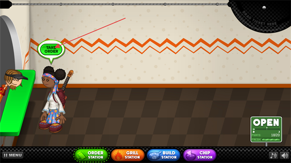 1、打開游戲進入第一天的營業(yè),點擊排隊中的顧客頭頂?shù)木G色按鈕提供點餐服務(wù)。