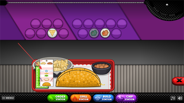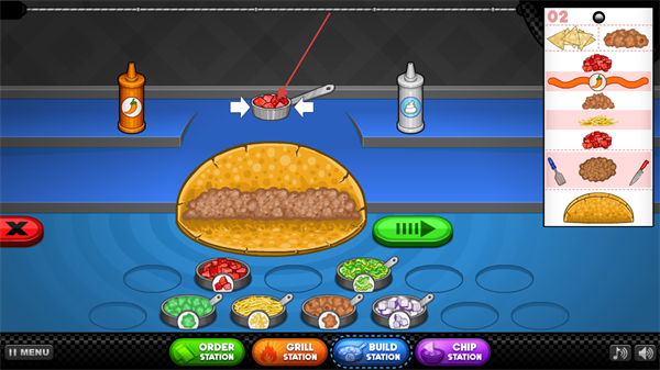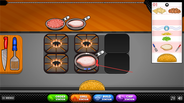 2、根據(jù)顧客選擇的肉餡選擇進行煎炒,當(dāng)進度條到紅色區(qū)域需要拿小刀進行切塊,到藍色區(qū)域需要進行翻炒。