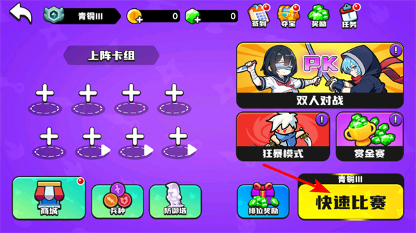 1、選擇對戰(zhàn)模式,模式選擇是開啟卡牌對戰(zhàn)的關(guān)鍵操作,選擇后可進(jìn)入雙人對戰(zhàn)、狂暴模式玩法,開啟對決之旅。