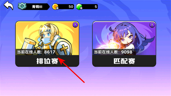 1、選擇對(duì)戰(zhàn)類型,類型選擇是開啟競技的關(guān)鍵操作,選擇后可進(jìn)入排位賽或匹配賽,開啟卡牌對(duì)戰(zhàn)之旅。