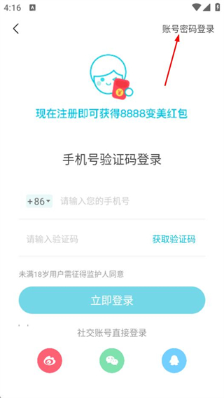 2、在登錄頁(yè)面,點(diǎn)擊右上角賬號(hào)密碼登錄選項(xiàng),切換到賬號(hào)密碼登錄界面。