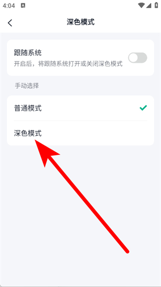 4、在深色模式頁面,手動(dòng)選擇,點(diǎn)擊深色模式,完成設(shè)置。