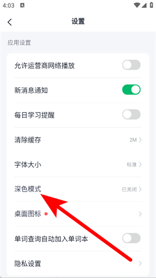 3、在設(shè)置頁面,點(diǎn)擊深色模式選項(xiàng),進(jìn)入選擇頁面。
