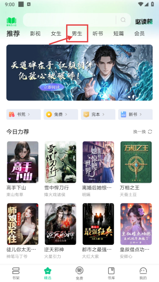 1、打開小說閱讀類APP,點擊頂部男生分類標簽,進入男生小說分類頁面。