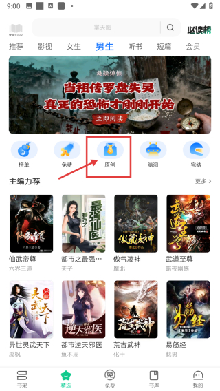 2、在男生小說分類頁面,點擊原創(chuàng)選項,進入原創(chuàng)小說列表頁面。