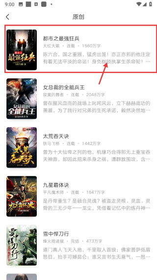 3、在原創(chuàng)小說列表頁面,選擇都市之最強狂兵小說,進入小說詳情頁面。