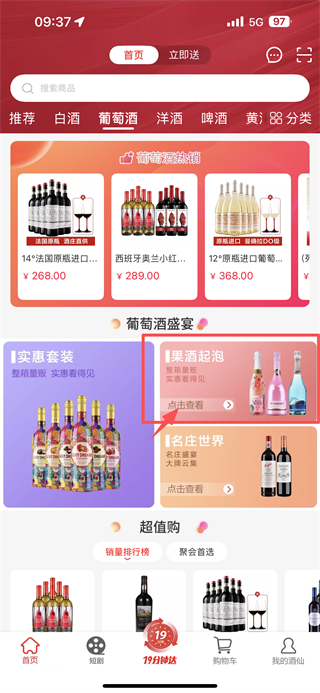 1、打開酒類購物類APP,點擊頂部葡萄酒分類標簽,進入葡萄酒分類頁面。