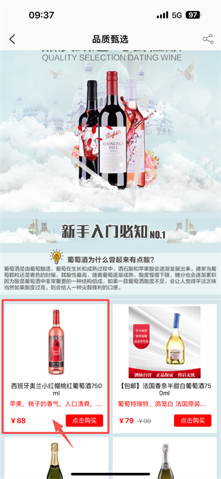 3、在品質(zhì)甄選頁面,選擇西班牙奧蘭小紅帽桃紅葡萄酒750ml商品,進入商品詳情頁面。