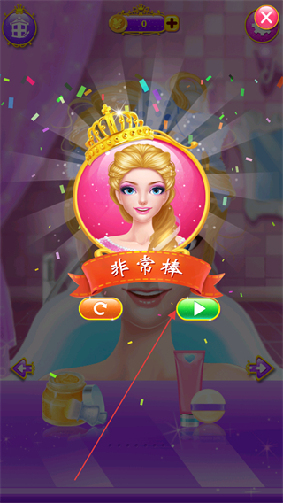 4、完成一系列美妝護理后,公主形象煥然一新,獲得非常棒的評價,可繼續(xù)挑戰(zhàn)或進入下一個美妝環(huán)節(jié)。