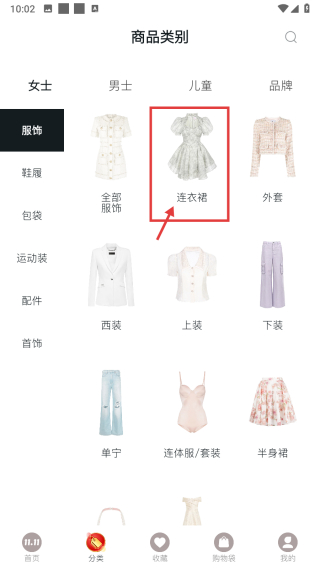 1、打開(kāi)服飾購(gòu)物類APP,點(diǎn)擊底部分類選項(xiàng),進(jìn)入商品類別頁(yè)面。