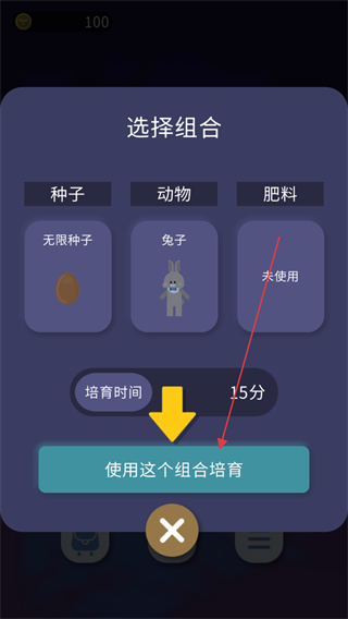 3、選擇種子、動(dòng)物和肥料的組合,點(diǎn)擊使用這個(gè)組合培育,等待培育時(shí)間結(jié)束。