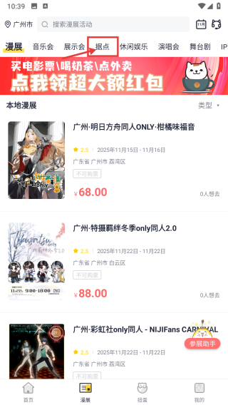 1、打開生活服務(wù)類APP,點擊底部漫展選項,進(jìn)入漫展相關(guān)頁面。