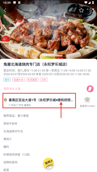 4、在店鋪詳情頁面,查看該店鋪的詳細(xì)地址信息,地址為“番禺區(qū)亞運大道1號永旺夢樂城4樓和府撈面旁。