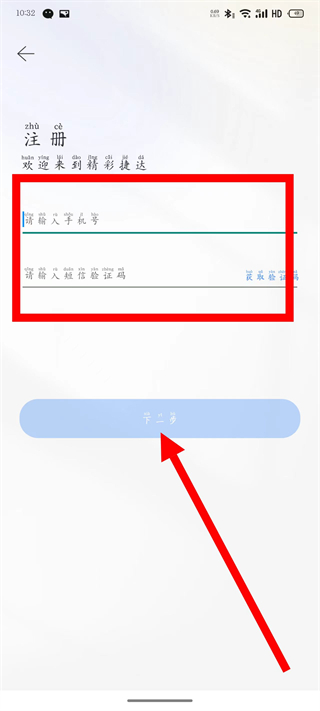 4、輸入手機(jī)號和驗(yàn)證碼后,點(diǎn)擊下一步,完成注冊登錄。