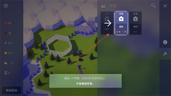 1、在不同區(qū)域如森林,選擇建造狩獵場(chǎng),它是食物的額外來(lái)源,建造過(guò)程中結(jié)束回合可完成施工。