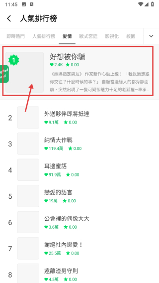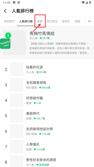 2、在人氣排行榜頁面,點擊愛情分類標(biāo)簽,進入愛情類作品列表頁面。