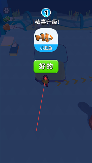 3、升級后會獲得新的魚類,如小丑魚,點(diǎn)擊好的繼續(xù)游戲。