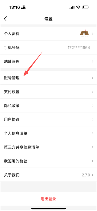 4、在賬號管理頁面,點擊賬號注銷選項,進入賬號注銷說明頁面。