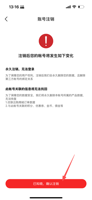 5、在賬號注銷說明頁面,點擊確認注銷按鈕,完成賬號注銷操作。