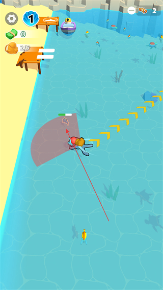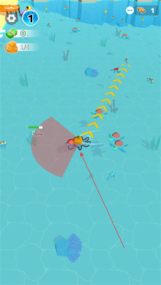 1、操控角色在水下區(qū)域移動,沿著黃色箭頭指引的路徑,收集魚類和資源。