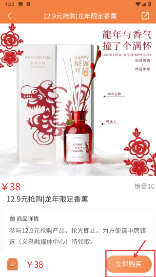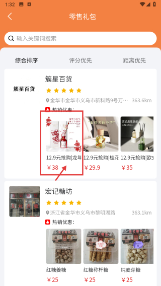 3、在零售禮包商品列表頁面,選擇簇星百貨的12.9元搶購|龍年限定香薰商品,進入商品詳情頁面。