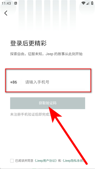 3、在注冊(cè)登錄頁面,輸入手機(jī)號(hào)后,點(diǎn)擊獲取驗(yàn)證碼。