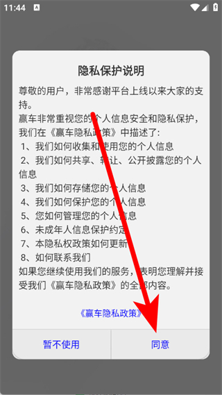 1、打開贏車網(wǎng),在隱私保護(hù)說(shuō)明彈窗中點(diǎn)擊同意。