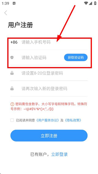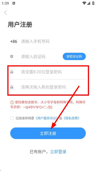 3、設(shè)置登錄密碼,再次確認(rèn)密碼,點(diǎn)擊立即注冊(cè),完成注冊(cè)操作。