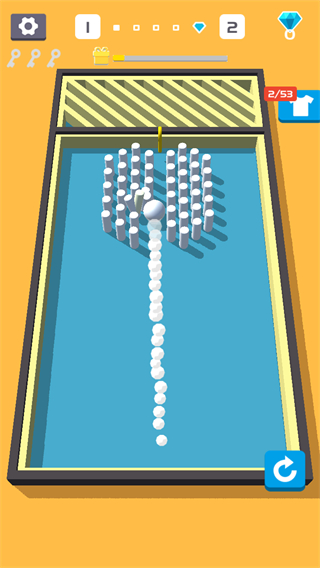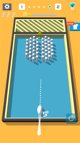 1、操控白色小球,調(diào)整發(fā)射角度,瞄準(zhǔn)上方的柱子區(qū)域發(fā)射。