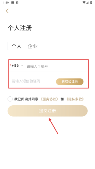 4、在個人注冊頁面,輸入手機號、短信驗證碼后點擊提交注冊按鈕,完成賬號注冊操作。