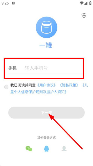 2、在登錄注冊(cè)頁面,輸入手機(jī)號(hào),勾選同意后點(diǎn)擊下一步。
