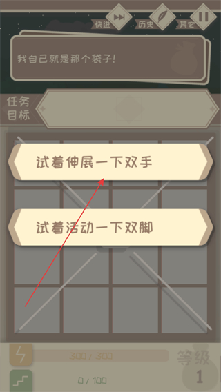 2、玩家開(kāi)局除了知道自己是個(gè)袋子啥也不是,通過(guò)點(diǎn)擊選項(xiàng)觸發(fā)劇情框。