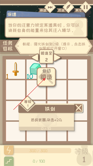3、通過(guò)點(diǎn)擊鐵劍進(jìn)行強(qiáng)化鍛造,努力提升能力決定自己的命運(yùn)和結(jié)局。