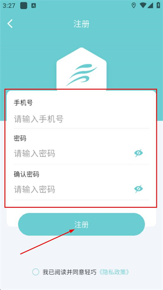 2、在注冊界面輸入手機號、密碼、確認密碼,點擊注冊。
