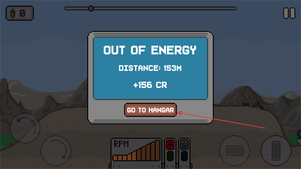 4、若能量耗盡,點(diǎn)擊GOTOHANGAR返回機(jī)庫(kù),可升級(jí)賽車后繼續(xù)游戲。