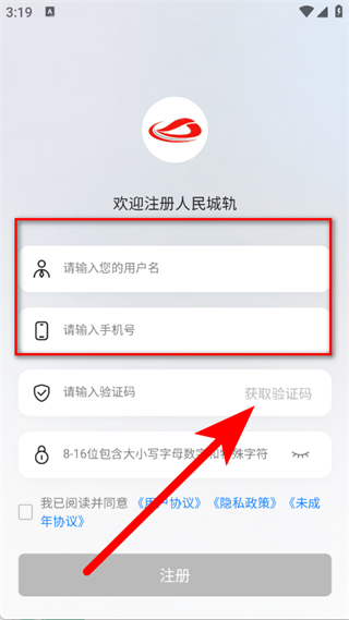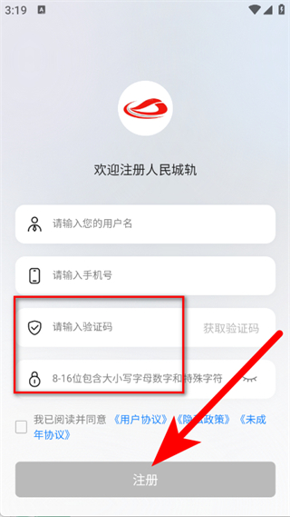 4、輸入驗證碼并設置密碼,勾選協(xié)議后,點擊注冊按鈕,完成注冊。